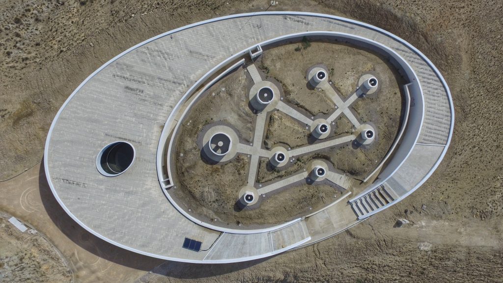 La forma elíptica del edificio rodea y protege la zona de observación de los telescopios que se sitúa en la parte más alta de la montaña, mientras que el interior se convierte en un museo, salas de trabajo y de difusión de la astronomía.